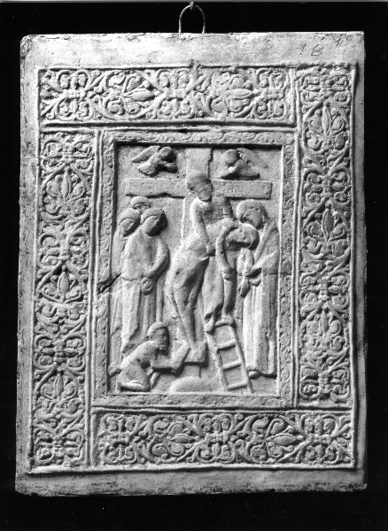 Formella ornata in bassorilievo isolata dall'imposta di un portale. La sce na firmata è racchiusa da cornice a motivi vegetali.. Figure: Apostoli; Donne. Personaggi: Cristo