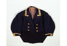 Giacca tipo frac in saia di canapa rossa con collo, parte anteriore, paramaniche e bordi della falde in lana bianca. Ornata con passamaneria di 1 cm in oro filato e lamina d'oro, e una di 4 mm sempre in filo e lamina d'oro. Sul davanti sono state cucite delle paillettes. Bottoni in ottone. Fodera in lino.. soggetto assente