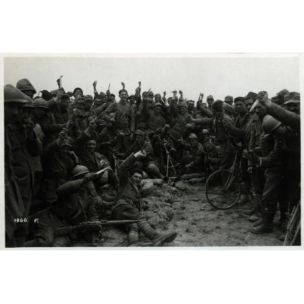 Veneto - San Michele - arditi - biciclette - pugnali - armi da fuoco - artiglieria - 1918, Veneto, San Michele, arditi al campo festeggiano l'azione vittoriosa impugnando pugnali e armi da fuoco