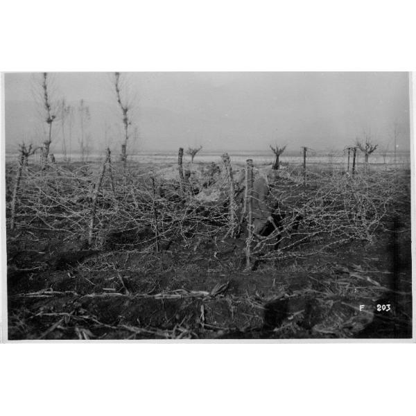 Crocetta del Montello - grave di Ciano - fiume - Piave - soldati italiani - reticolato - riparazione - 1917, Crocetta del Montello, soldato italiano impegnato nella riparazione di un reticolato sulle grave di Ciano presso il fiume Piave