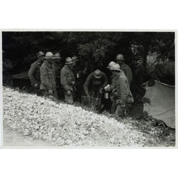 Veneto - Capo d'Argine - Losson - rancio - 9° battaglione - bersaglieri ciclisti - trincee - marmitte - bauli termici - gavette - 1918 (positivo)