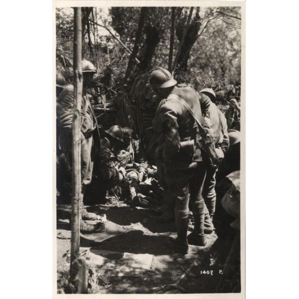 Veneto - Ponte di Piave - sanità - feriti - medicazioni - fasciature - trincee - ripari - rifugi - 1918, Veneto: Ponte di Piave, prime cure a un ferito lieve