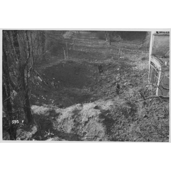 Padova - Palazzo Treves - incursioni aeree - bombardamenti - crateri - 1918, Padova, cratere prodotto da una bomba nel giardino di Palazzo Treves dopo l'incursione aerea nemica