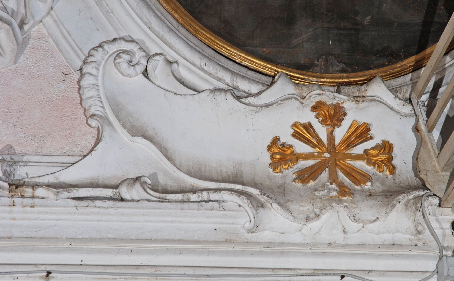 Cornice ovale in stucco con ai lati due angeli, uno per parte, nell'atto di reggerla. Nella parte inferiore vi è una sorta di cartiglio con decorata una croce raggiata e dorata.