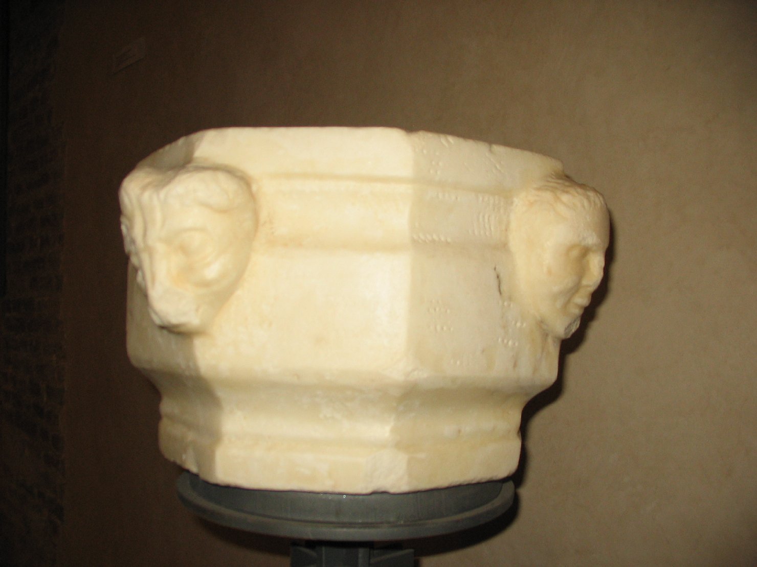 Piccola acquasantiera ottagonale in marmo scolpito con protomi virili e zo omorfe