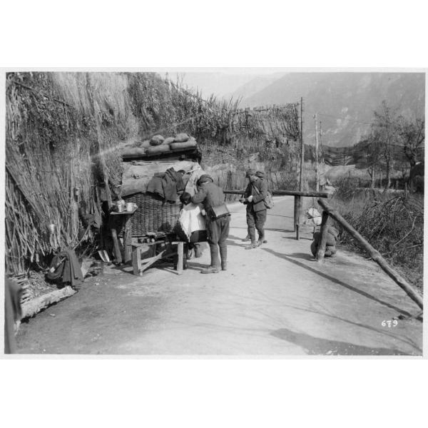 Val d'Astico - sbarramenti - momenti di riposo - barbieri - 1918, Val d'Astico, momenti di riposo in prossimità di uno sbarramento stradale: un barbiere