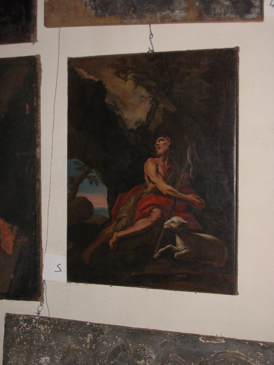 dipinto ad olio su tela raffigurante S.Giovanni Barttista nel deserto tra le rocce accompagnato da un agnello.