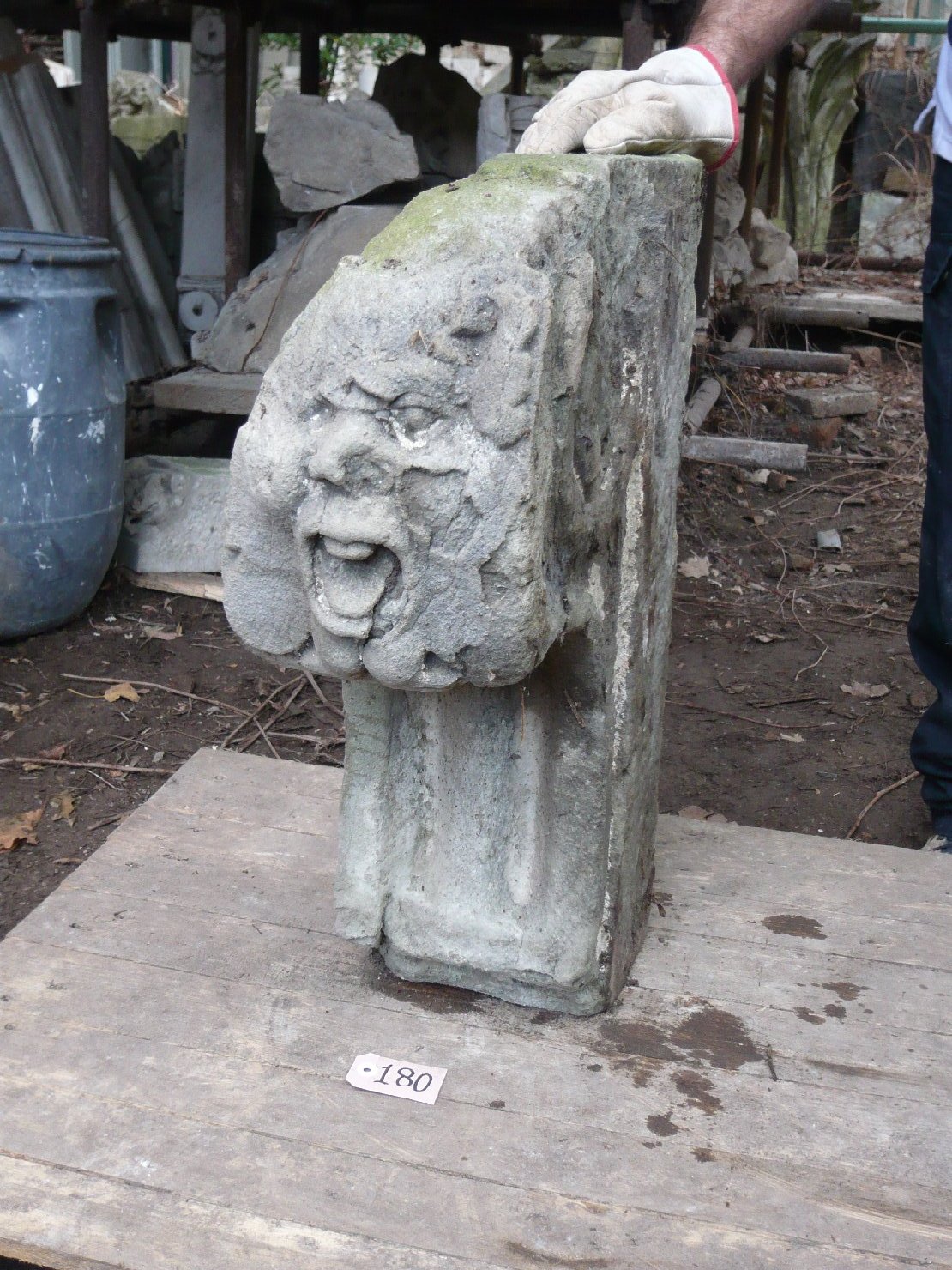 Mensola architettonica in marmo decorata con voluta e un mascherone dala bocca aperta.