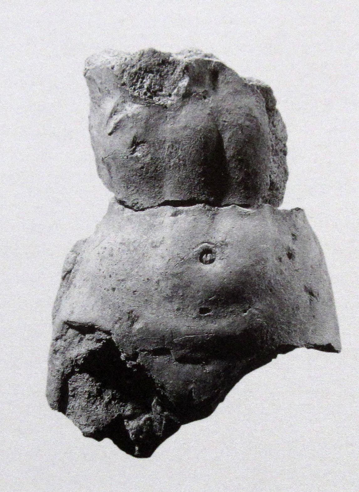 Frammento di figura femminile pertinente a gruppo statuario frontonale, in argilla grigia e ingobbio grigiastro, realizzata ad alto rilevo. Il lato destro appare non rifinito.. Ventre di una figura femminile nuda, probabilmente frontale e stante. I particolari anatomici sono resi in modo realistico. Sul fianco resta traccia di un elemento circolare, forse il lembo di un mantello