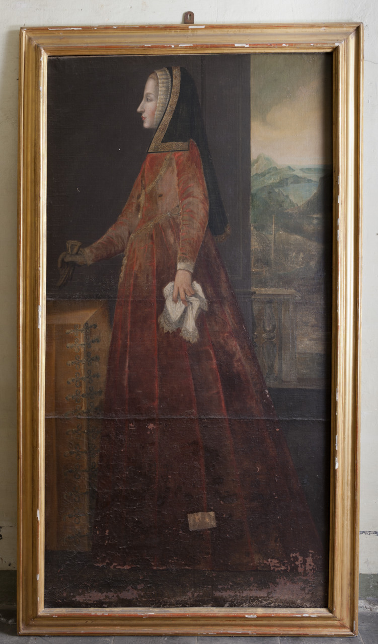 Il personaggio è rappresentato entro una stanza, stante di profilo con il viso rivolto verso sinistra. I capelli sono raccolti all’interno di un copricapo con cuffia e velo che scende sino alle spalle dietro la schiena, profilato di passamaneria dorata. Indossa una veste dalle maniche lunghe sino al polso, composta da corpetto e gonna che ricopre in pieghe parallele fino ai piedi. Con una mano tiene un guanto e con l’altra un fazzoletto bordato di pizzo. Al collo una collana che ricade sul petto. Sulla sinistra, è rappresentato un tavolo ricoperto da una tovaglia con ricca passamaneria agli angoli. Sulla sinistra, da una porta finestra aperta si intravede una balaustra e un brano di paesaggio con architetture, non chiaramente distinguibili, una vallata, montagne e un lago. La tela è posta entro una cornice intagliata e dorata modanata di formato rettangolare. Battuta liscia; fascia modanata.. PERSONAGGI: Jolanda di Savoia. ABBIGLIAMENTO: copricapo; velo; abito. OGGETTI: fazzoletti; tavolo; tovaglia; balaustra. PAESAGGIO: montagne; vallata; lago. ARCHITETTURE: edificio con cupola