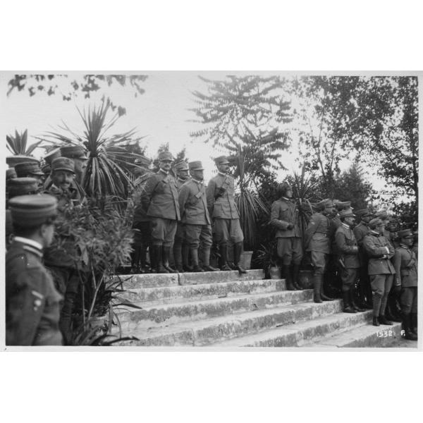 Veneto - Marostica - Nole - premiazioni - onorificenze - rivista - sfilata - 1° divisione - arditi - ufficiali - generali - Diaz - Grazioli - re - 1918, Veneto, Marostica, campo di Nole, premiazione e rivista della 1° divisione arditi con S.M. re Vittorio Emanuele III e i generali Armando Diaz e Francesco Saverio Grazioli