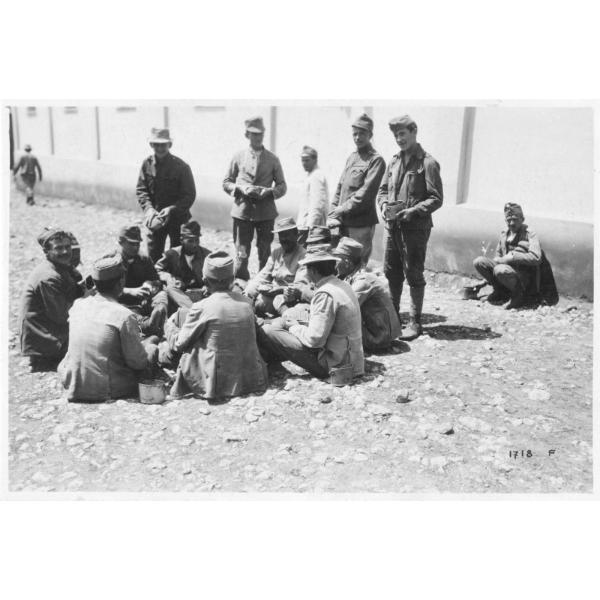 Lazio - Cassino - campi di prigionia - prigionieri - rancio - cibo - gavette - 1918, Lazio, Cassino, prigionieri consumano il rancio nelle gavette seduti a terra nel campo di concentramento