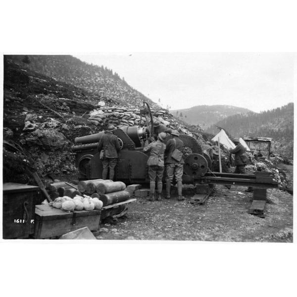 Veneto - altipiani - cima Ekar - monte Valbella - artiglieria - artiglieri - pezzi di artiglieria - artiglieria pesante - munizioni - proietti - 1918 (positivo)