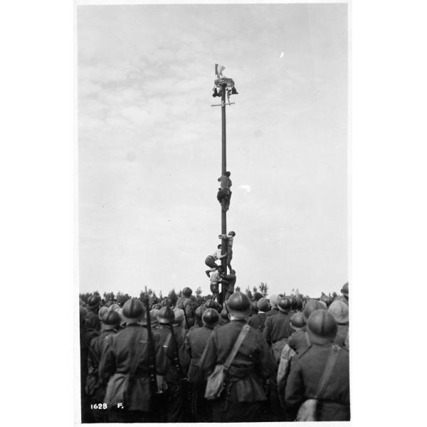 Veneto - Treviso - Brigata Veneto - festeggiamenti - cuccagna - soldati - 1918, Veneto, Treviso, festeggiamenti per la Brigata Veneto, l'albero della cuccagna al campo