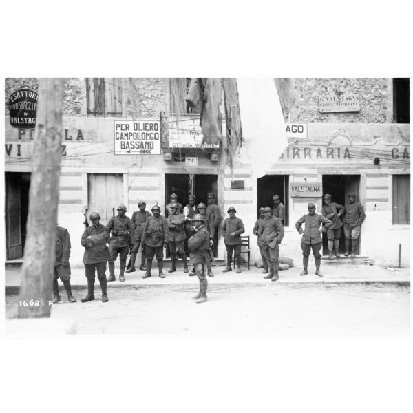 Veneto - Valstagna - corrispondenza - militari - 1918, Veneto, Valstagna, posto di corrispondenza con militari in attesa e numerose insegne civili e cartelli con indicazioni stradali sulla facciata. Su uno si legge: "Valstagna", su un altro "Per Oliero/ Campolongo/ Bassano/ ---", su un altro le direzioni della strada militare verso Asiago e Marostica