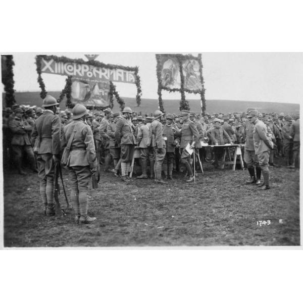 Veneto - Puffele - altipiani - genio - 13° corpo d'armata - festeggiamenti - premiazioni - onorificenze - soldati - ufficiali - generali - Sani - 1918, Veneto, Altopiano dei Sette Comuni, Puffele, festeggiamenti del Genio al 13° corpo d'armata e consegna di riconoscimenti al valore ai militari. Sul cartellone dietro gli ufficiali si legge: "XIII Corpo d'Armata"