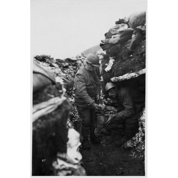 Monte Tomba - soldati italiani - prime linee - bevande - 1918, Monte Tomba, vengono distribuite bevande calde tra i soldati in trincea