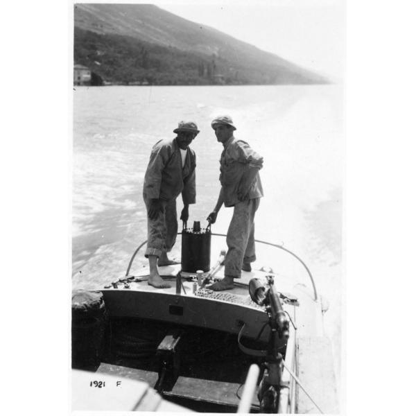 Lago di Garda - marinai - regia marina - mas - M.A.S. - imbarcazioni - bombe - 1918, Lago di Garda, marinai su un M.A.S. della Regia Marina per collaudare bombe antisommergibile