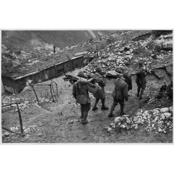 feriti - alpini - barelle - trasporti - 1918, Alpini portano verso un posto di medicazione un ferito