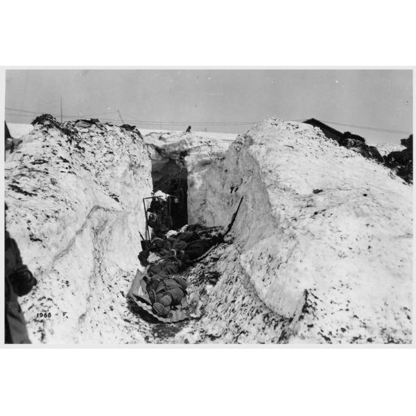 Trentino-Alto Adige - Lobbia - passo della Lobbia - Adamello - trincee - montagna - feriti - armi da fuoco - 1918, Trentino-Alto Adige, passo della Lobbia, gruppo dell'Adamello, feriti adagiati sul fondo di una trincea nella neve