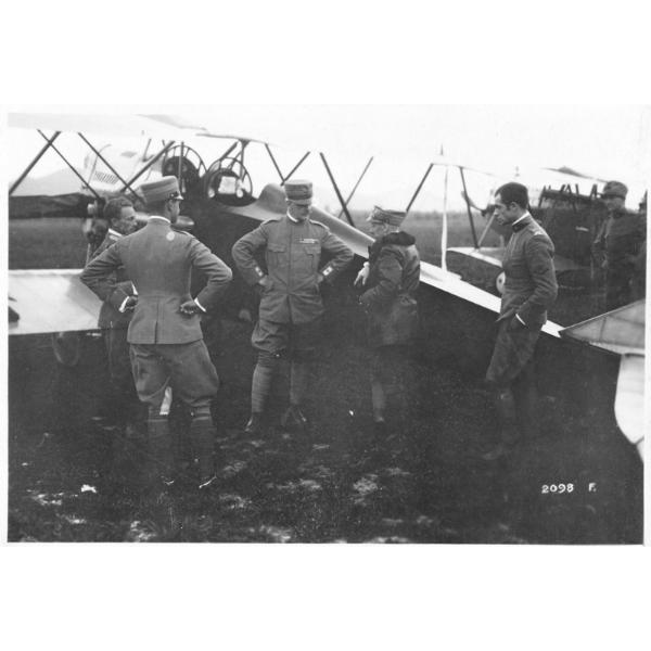 Veneto - Due Carrare - San Pelagio - campi di aviazione - velivoli - aerei - squadriglie - Serenissima - Raid su Vienna - generali - piloti - aviatori - D'Annunzio - Bongiovanni - 1918, Veneto, campo di aviazione di San Pelagio, comune di Due Carrare, Gabriele D'Annunzio e il generale Luigi Bongiovanni a colloquio davanti a un aereo