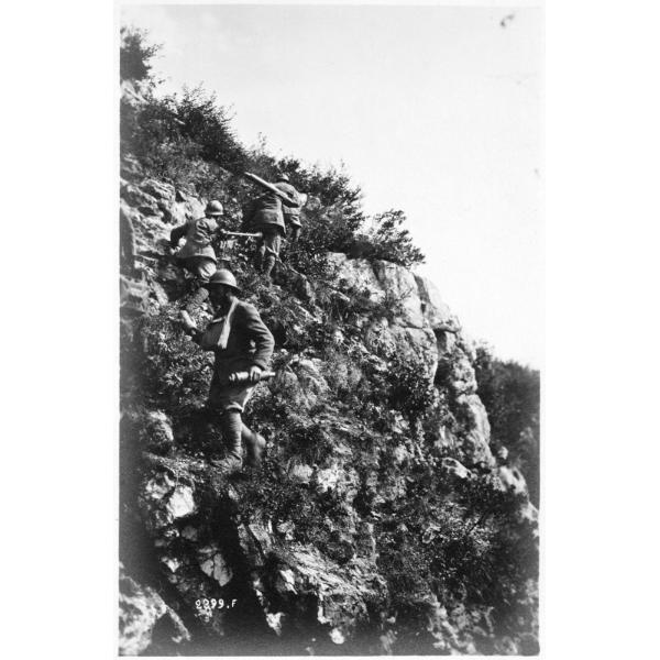 Trentino-Alto Adige - Val Lagarina - Malga Zugna - camminamenti - postazioni - pattuglie - artiglieria - pezzi di artiglieria - montagna - 1918, Trentino-Alto Adige, Val Lagarina, pattuglie di soldati salgono dai camminamenti su Malga Zugna trasportando pezzi di artiglieria leggera in posizione