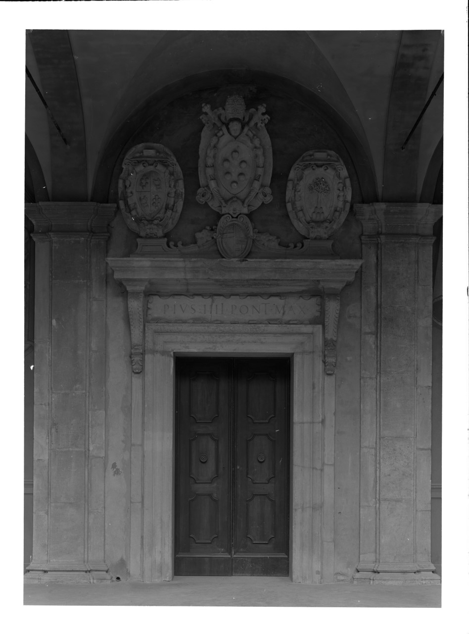 Italia - Emilia-Romagna - Bologna - Palazzo dell'Archiginnasio - Loggiato inferiore - Arcata XIII; Architettura - Elementi architettonici - Arcate - Portali; Scultura - Elementi decorativi - Sculture - Bassorilievi; Araldica - Stemmi - Emblemi; Scultura - Conservazione - Restauro; Seconda Guerra Mondiale - Bologna - Bombardamenti