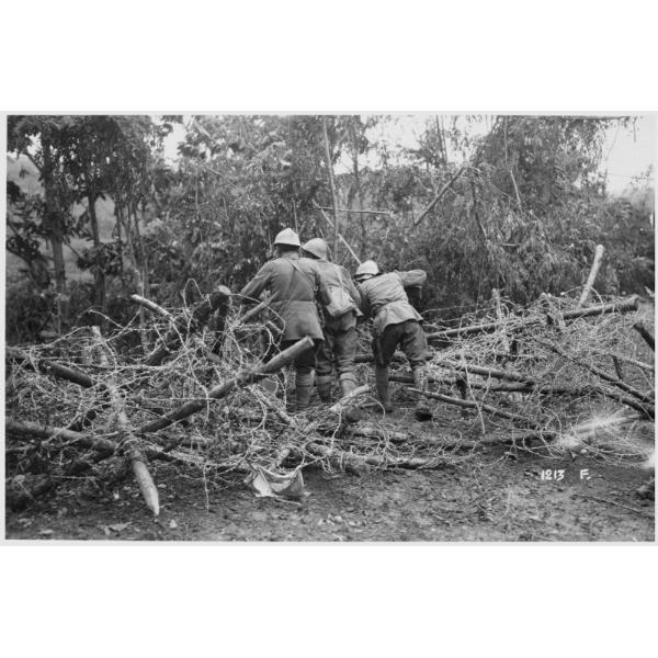 Giavera del Montello - soldati italiani - feriti - filo spinato - reti - 1918, Giavera del Montello, soldati impegnati nel salvataggio di un ferito rimasto intrappolato nel filo spinato