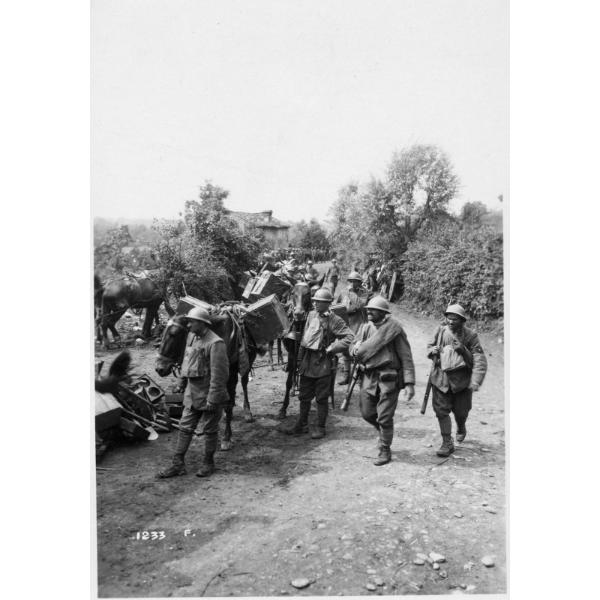 Montello - munizioni - muli - trasporti - 1918, Montello, soldati trasportano con i muli le munizioni sulle linee