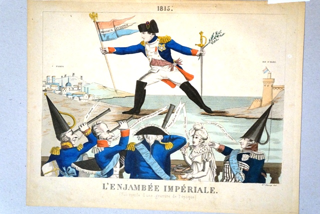 Napoleone tiene nella mano destra l'asta di una bandiera con una scritta e nella sinistra una spada e un ramoscello di olivo. Con un salto si porta dall'isola d'Elba a Parigi. Nella parte bassa conque personaggi lo osservano e dicono la loro: il primo a sinistra, il duca di Artoi, dice "Facciamo i nostri pacchetti". A destra il duca di Berry dice "Facciamogli una piccola guerra", e Luigi XVIII al centro, dice "Quest'uomo farà il suo cammino"
