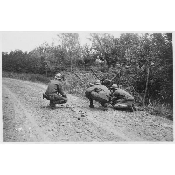Fossalta di Piave - sbarramenti - mitragliatrice - 1918, Fossalta di Piave, soldati con mitragliatrice presso uno sbarramento stradale