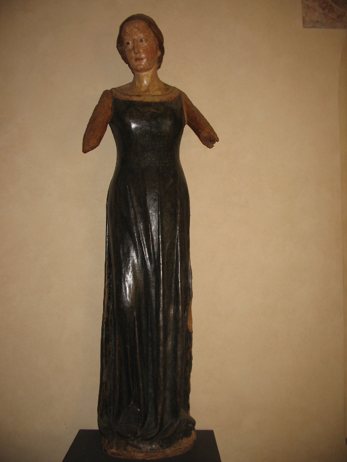 Scultura lignea intagliata e policromata raffigurante Vergine annunciata. La figura presenta una leggera inclinazione del volto verso destra ed indossa una lunga veste con uno scollo a barca.