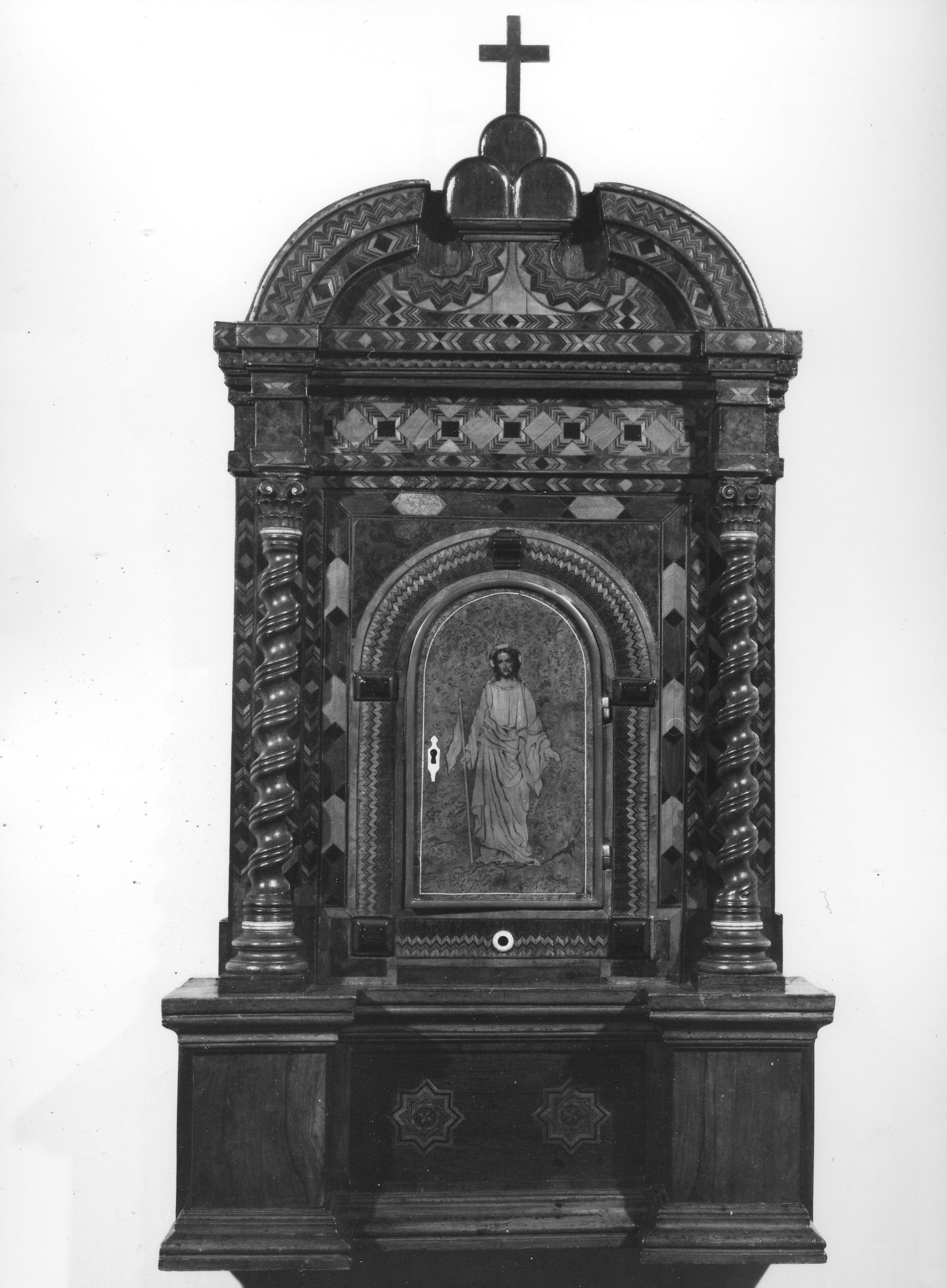 Ciborio dalla tipologia a tempietto. La base è parallelepipeda con avancorpi laterali su cui poggiano due colonne a torciglione con capitelli corinzi. Alla sommita è un piccolo frontone spezzato con bordo tondeggiante e con al centro un un monte a tre cime con crocetta apicale. La mostra ha intarsi a motivi decorativi geometrici: quadrati, losanghe, greche in legno di noce, mogano, castagno ed ebano. Sulla porticina l'immagine del Cristo Risorto.. Soggetti sacri: Personaggi: Cristo. Attributi: (Cristo) aureola; vessillo