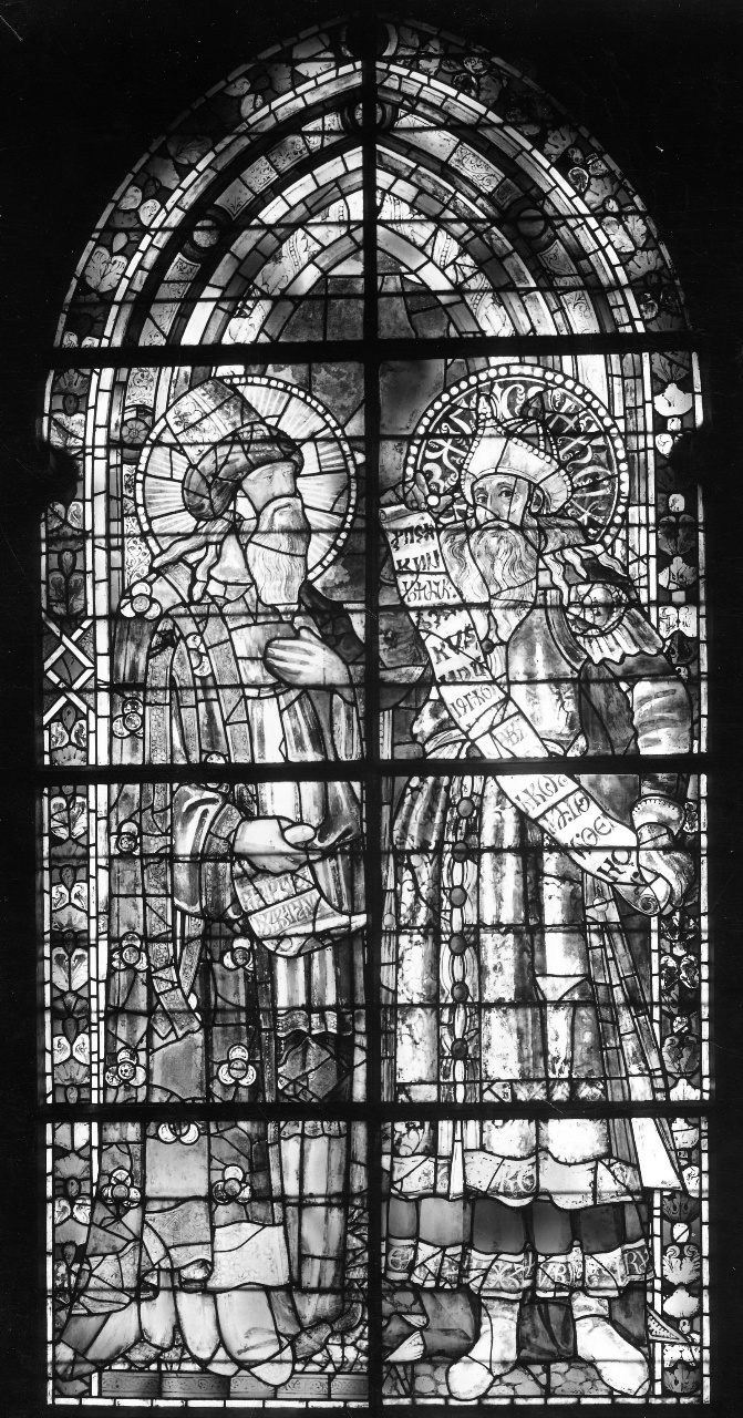 Vetrata cuspidata divisa in due registri e composta da sedici pannelli.. Soggetti sacri. Figure maschili: profeti (quattro). Abbigliamento. Attributi: (profeti) cartigli. Elementi architettonici: partitura con cornice ed archetti ogivali; arco cuspidato. Decorazioni: cornice esterna con motivi floreali stilizzati; cornice con racemi e rosette; cornice con nastro attorcigliato