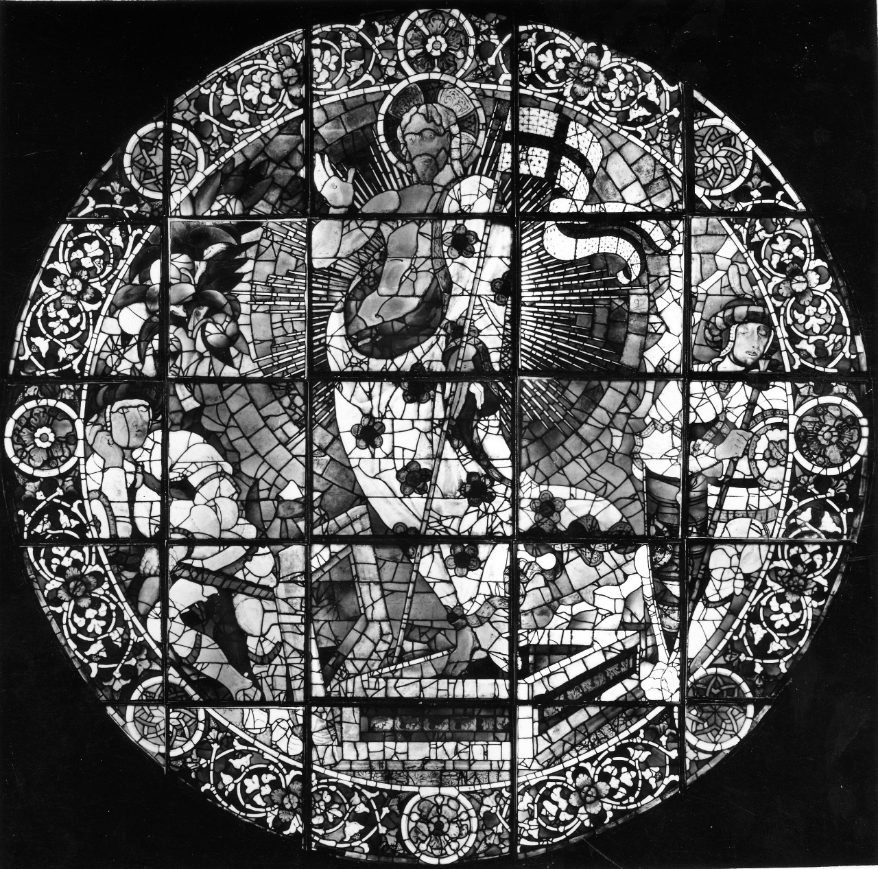 Vetrata circolare composta da venticinque pannelli.. Soggetti sacri. Personaggi: Gesù Cristo. Figure maschili: soldati. Abbigliamento: all' antica. Attributi: (Gesù Cristo) vessillo della Resurrezione. Oggetti: sepolcro; spade; scudi. Paesaggi: rocce; arbusti; albero con frutti. Allegorie-simboli: raggi divini. Decorazioni: cornice con motivi vegetali stilizzati e tondi decorati con fiori stilizzati e motivi geometrici