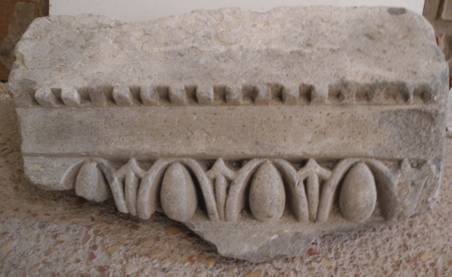 Architrave costituito da coronamento liscio, fascia superiore a profilo ad angolo e fascia inferiore decorata da kima ionico con ovoli e dardi rovesci; esternamente corre una fascia a dentelli.. DECORAZIONI: OVOLI; DARDI; FOGLIE; DENTELLI