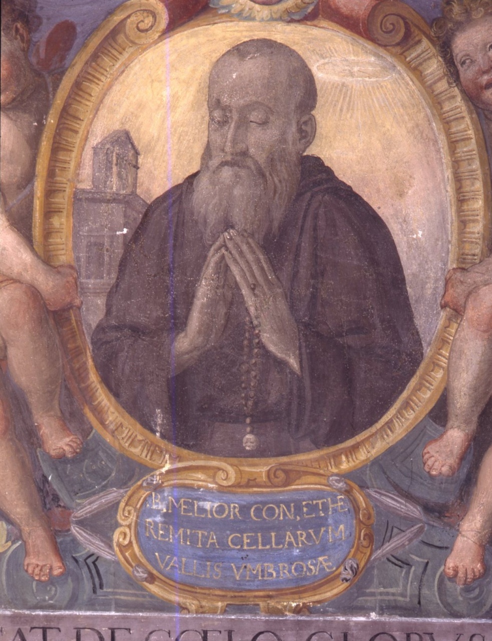dipinto murale. Soggetti sacri. Personaggi: Beato Meliore. Attributi: (Beato Meliore) monastero di Vallombrosa; rosario; nuvola. Figure: cherubino; angeli. Decorazioni: cartella; cornice a volute; tenda. Architetture: Monastero di Vallombrosa. Fenomeni divini: nuvola. Abbigliamento religioso