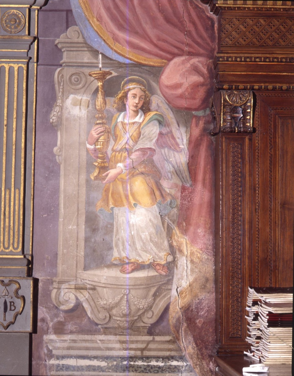 dipinto murale. Soggetti sacri. Figure: angelo. Elementi architettonici: nicchia. Oggetti: candelabro; cortina. Decorazioni: volute; festoni; cornici a ovuli; modanature; rosette