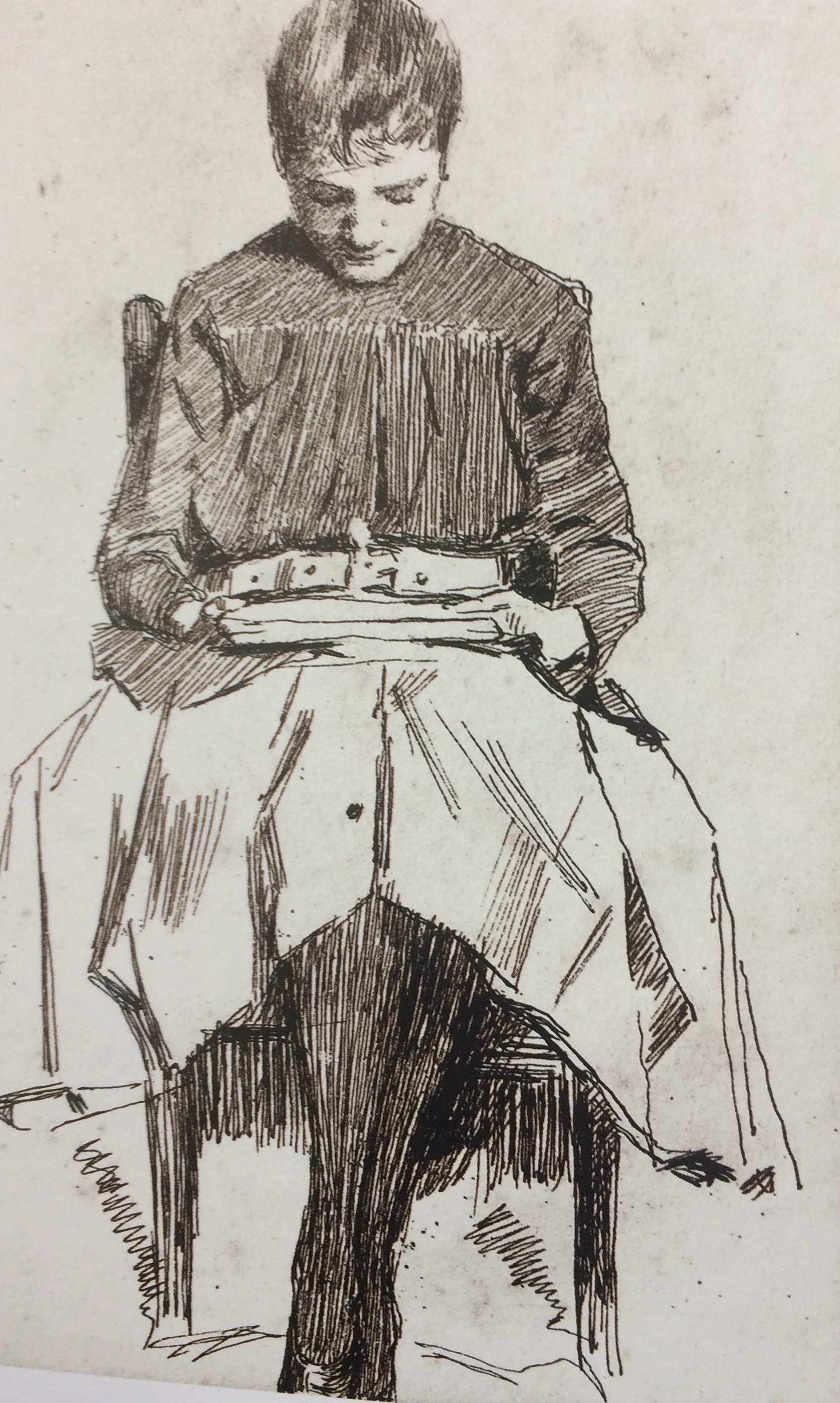 Disegno a penna su carta con cornice.. Il disegno raffigura la sorella dell'artista, seduta, mentre legge