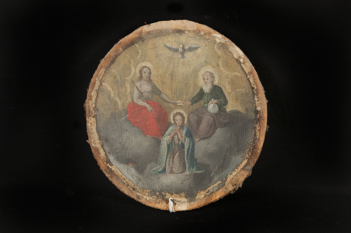 La Madonna a mani giunte e inginocchiata sulle nubi viene incoronata da Dio Padre e da Gesù Cristo. In alto al centro, circondata da raggi di luce, è la colomba dello Spirito Santo.. Personaggi: Madonna; Dio Padre; Gesù Cristo. Simboli: colomba dello Spirito Santo