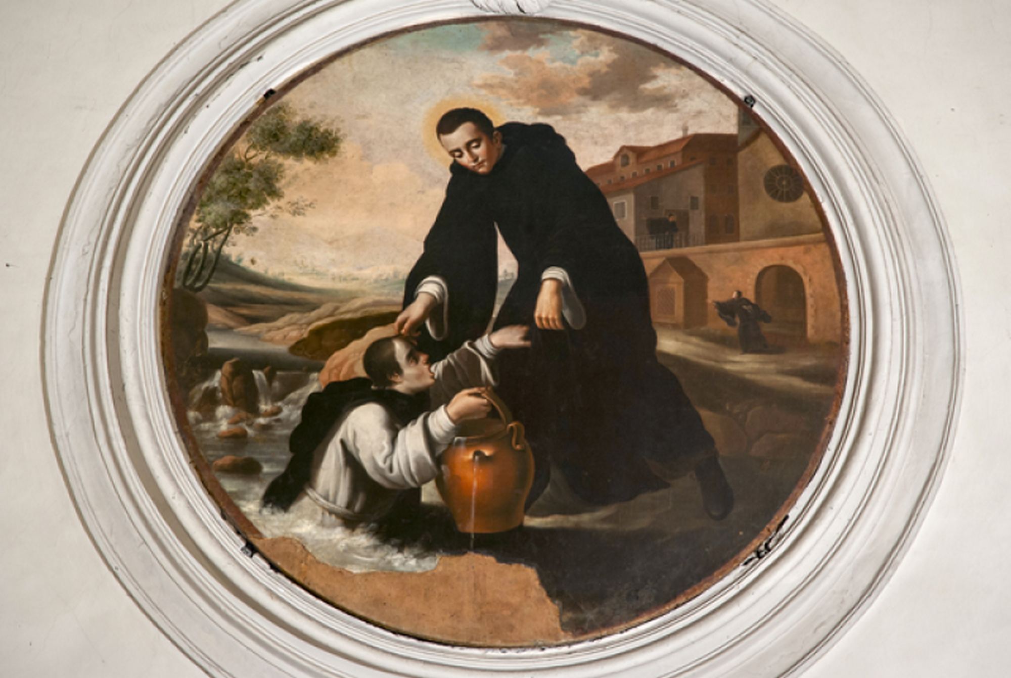 Dipinto circolare già inserito nel muro e contornato da cornicie in gesso. L'opera ad oggi (10/2017) rimane tra le macerie della Basilica di S. Benedetto. L'edificio è crollato durante lo sciame sismico che ha interessato la città di Norcia ad ottobre 2016.. SOGGETTI SACRI: S. Mauro salva S. Placido. PERSONAGGI: S. Mauro; S. Placido. ARCHITETTURE: chiesa; case. PAESAGGIO: torrente, alberi, nuvole