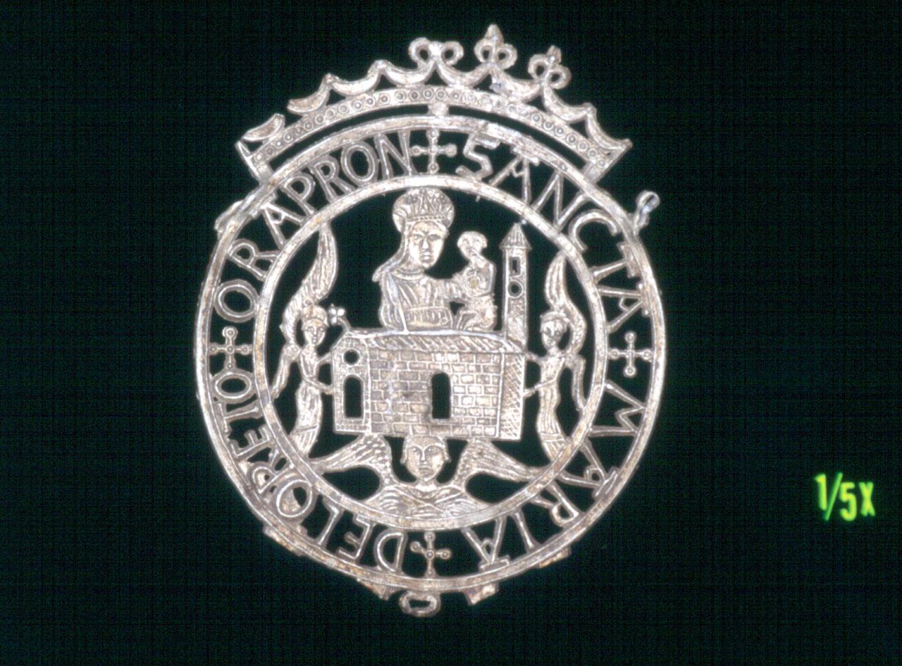 Toppa di serratura, coronamento a diadema.. Personaggi: Madonna; Bambino Gesù. Figure: angeli (3). Architetture: Santa Casa di Nazareth. Decorazioni: motivo ad anelletti incisi