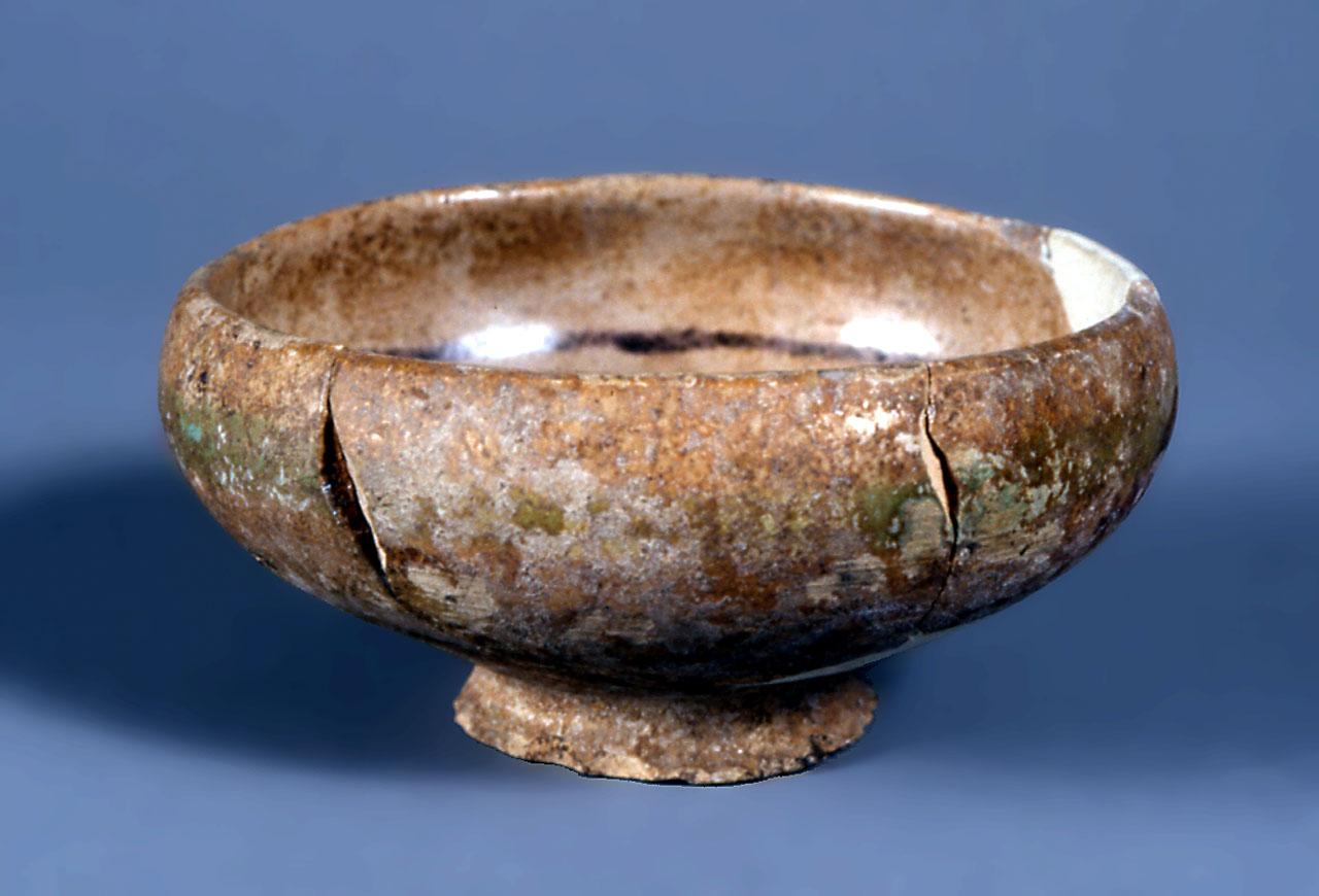 Piede a sezione circolare.. Decorazioni: tratteggio intrecciato; fiore; motivi geometrici