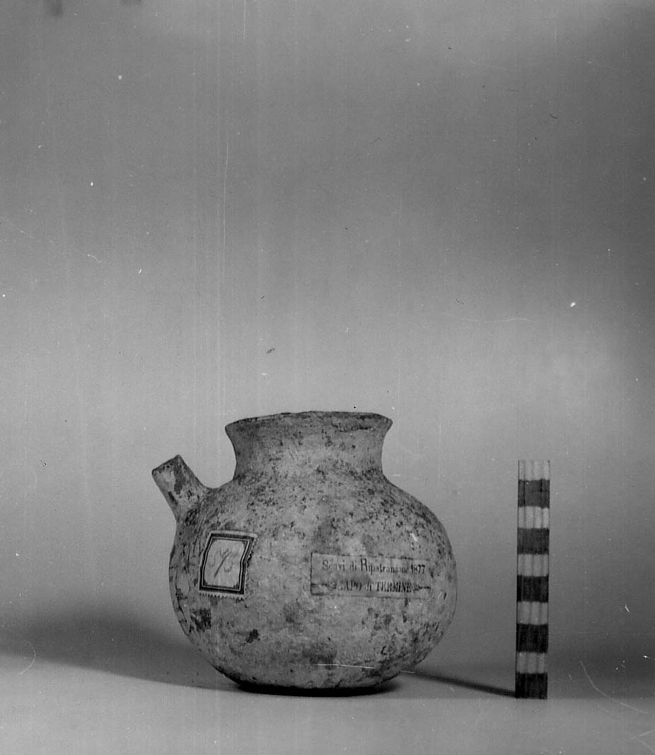 vaso a corpo globulare, collo a profilo concavo, orlo arrotondato, fondo convesso umbilicato; sul corpo, beccuccio cilindrico obliquo sulla spalla