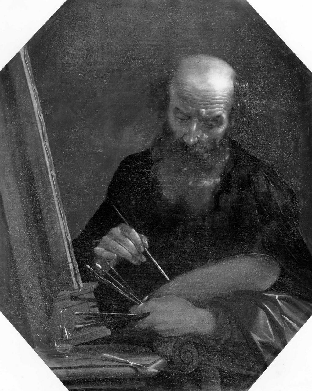 n.p.. Soggetti sacri. Personaggi: San Luca. Mobilia: sedia a braccioli; tavolo. Oggetti: cavalletto; dipinto; ampolla con olio; spatola; tavolozza; pennelli. Abbigliamento: manto rosso; veste blu