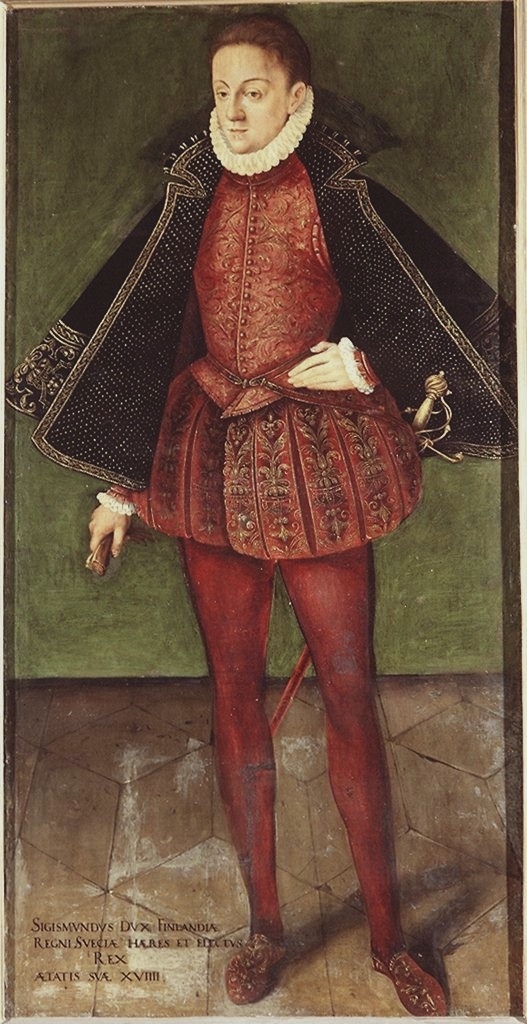 n.p.. Soggetti profani. Ritratti. Personaggi: Sigismondo Vasa. Abbigliamento: farsetto ricamato; calzebrache con calzoni tagliati; camicia con colletto e polsini a lattuga; scarpe ricamate; mantellina ricamata. Oggetti: spada. Interno