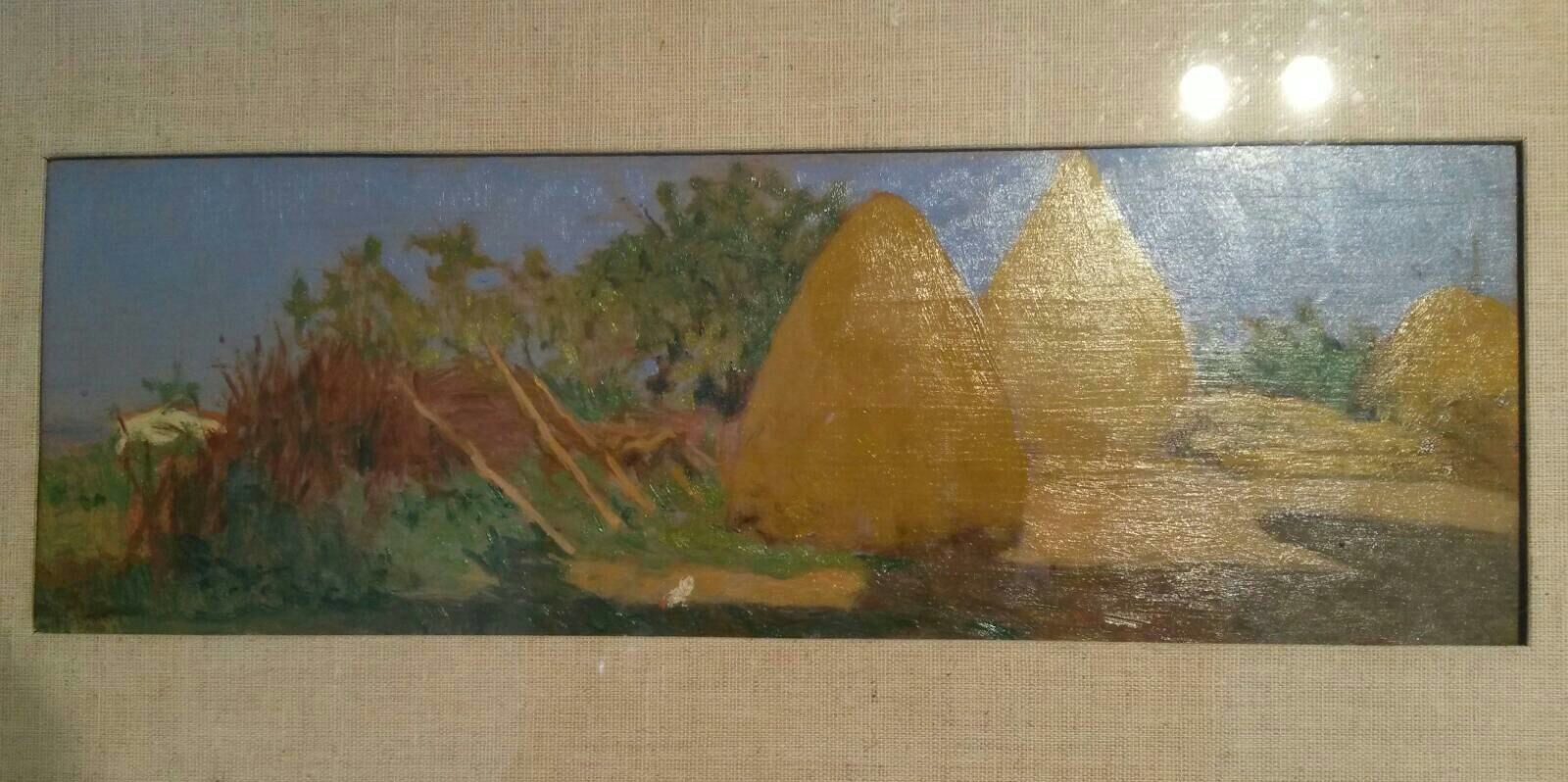 Dipinto a olio su tavola con cornice.. Il dipinto rappresenta alcuni pagliai inseriti in un paesaggio campestre