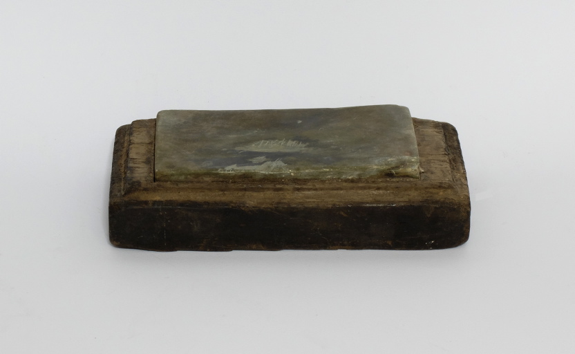 La pietra cote si presenta di forma rettangolare e di colore grigio incastonata in una base di legno. Semplice ed essenziale nella linea