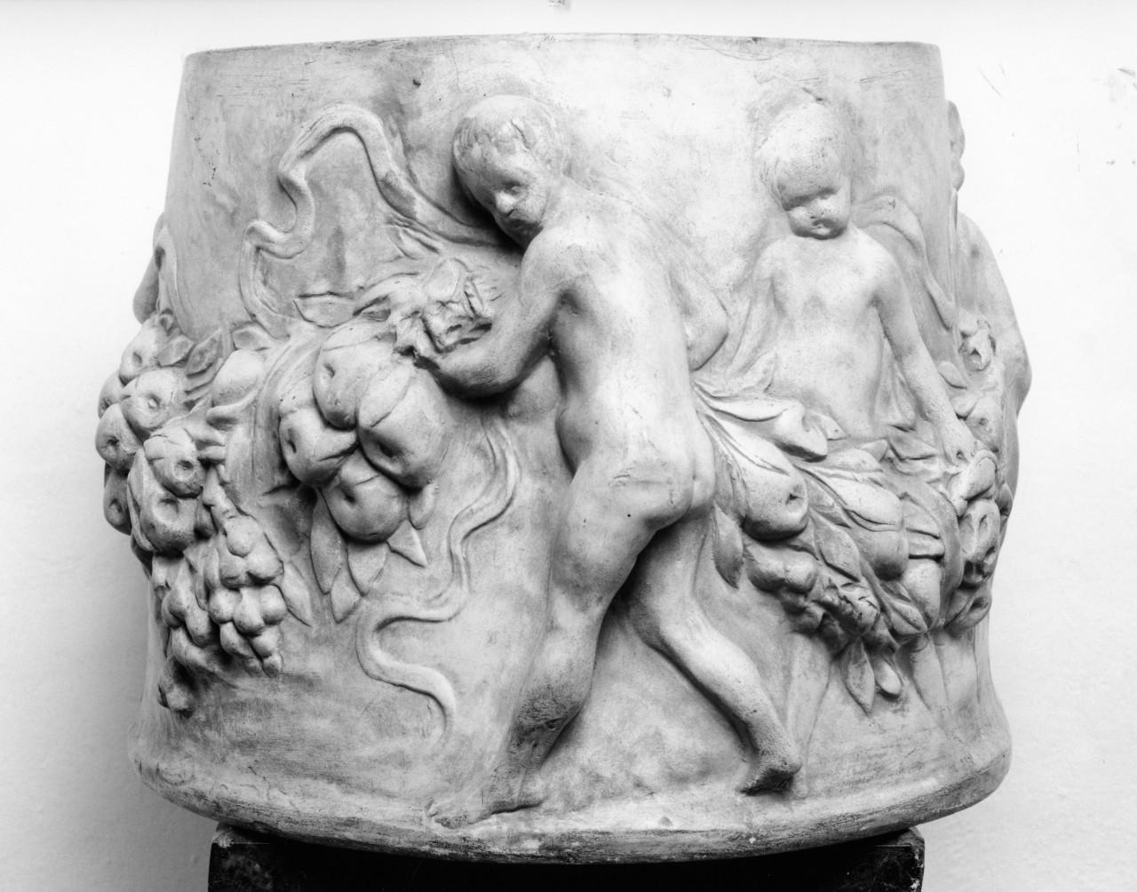 Cachepot cilindrico in gesso patinato decorato da putti festanti mentre sostengono festoni di foglie e frutti.. n.p