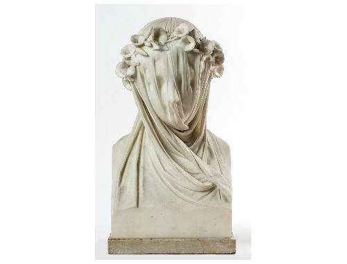Giovane fanciulla, ritratta a mezzobusto. Un velo la ricopre interamente. Sul capo, a fermare il tessuto, una ghirlanda fatta con campanule ed altre piante. L'opera poggia sopra un piedistallo, a forma di pilastrino, realizzato anch'esso in marmo.. Personaggi: ragazza. Attributi: Velo